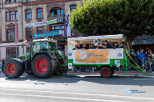 Mit einem vollbesetzten Planwagen, gezogen von einem Trecker, ging es im Sternmarsch, quer durch die Stadt.